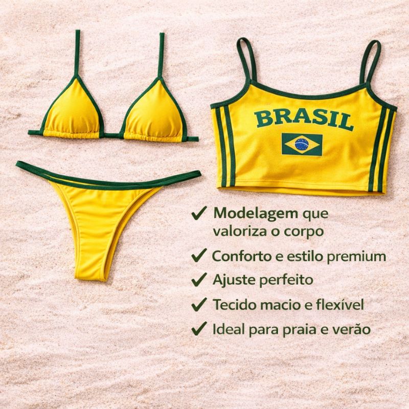 Sinta-se ainda mais confiante com o Conjunto Brasil Cropped + Biquíni , um look pensado para mulheres que querem destacar suas curvas com estilo e atitude. Inspirado nas cores da seleção brasileira.